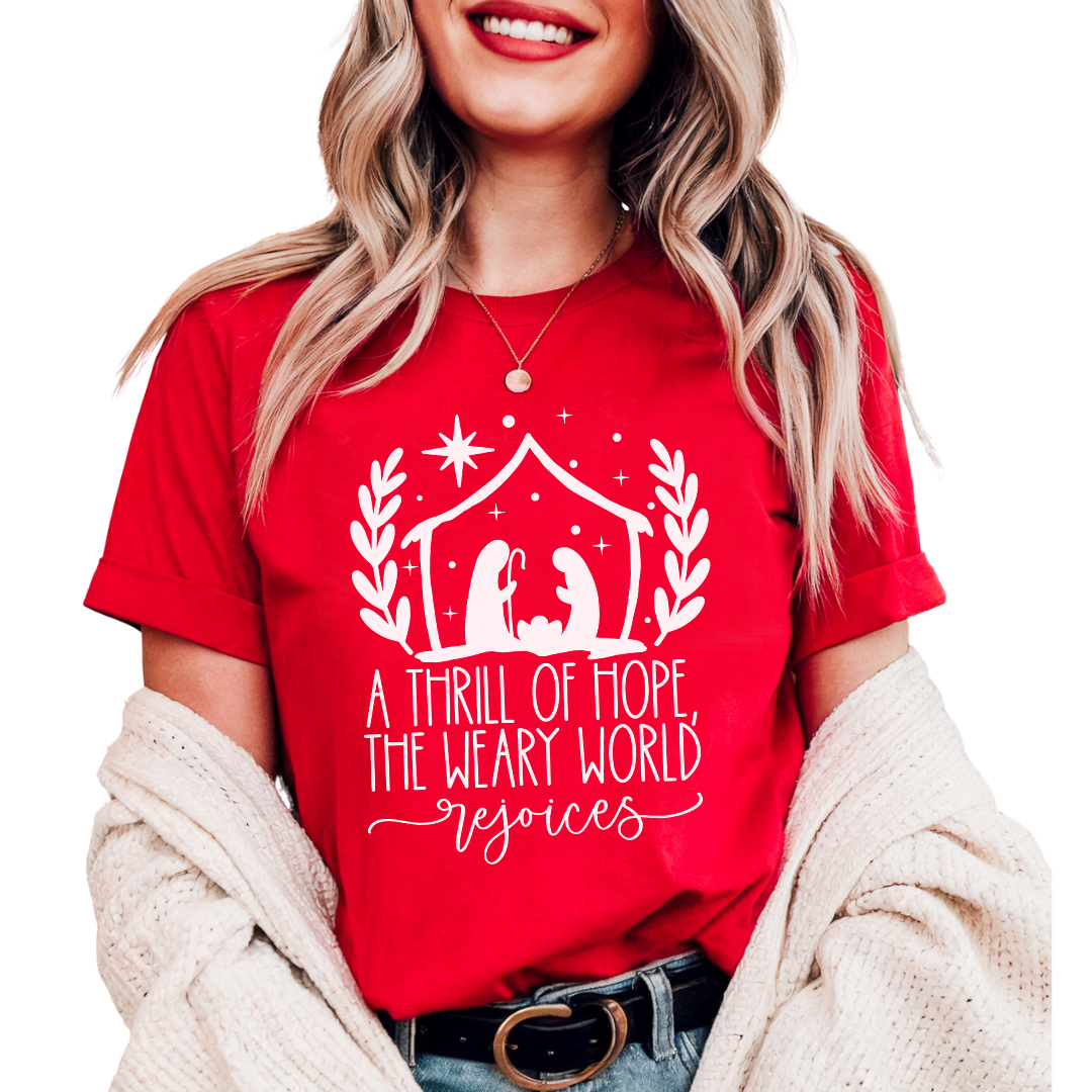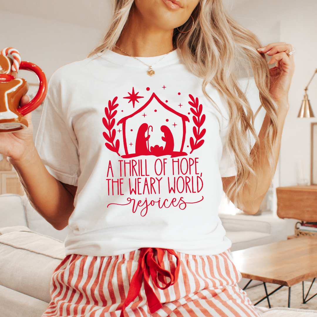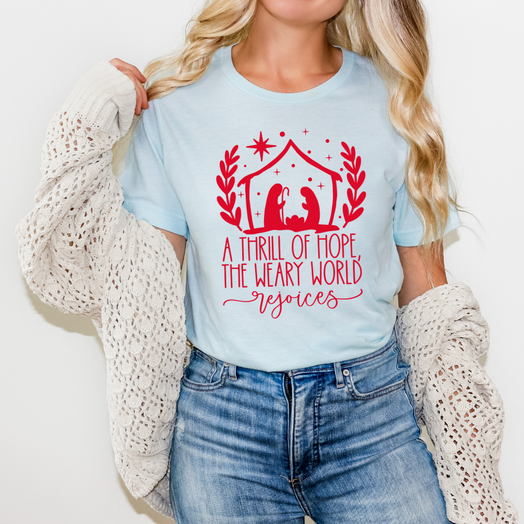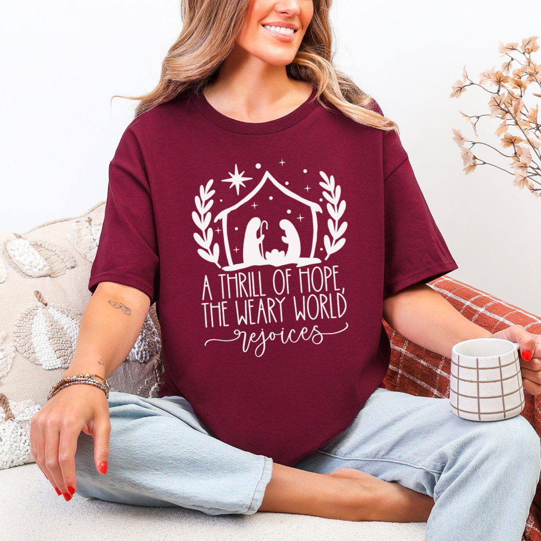 This beautiful “A Thrill of Hope, The Weary World Rejoices” shirt pairs the beloved Christmas lyric with a soft and elegant holiday design. Made for women who love faith, worship, Christmas hymns, and cozy seasonal outfits, this tee brings comfort and meaning everywhere you go.