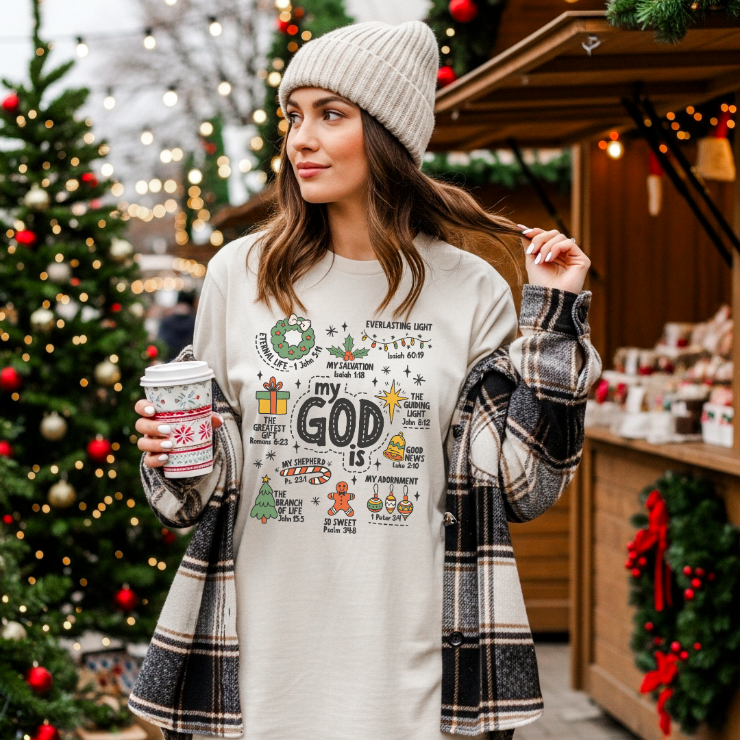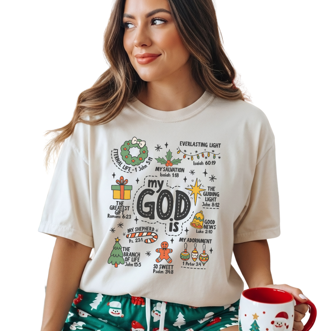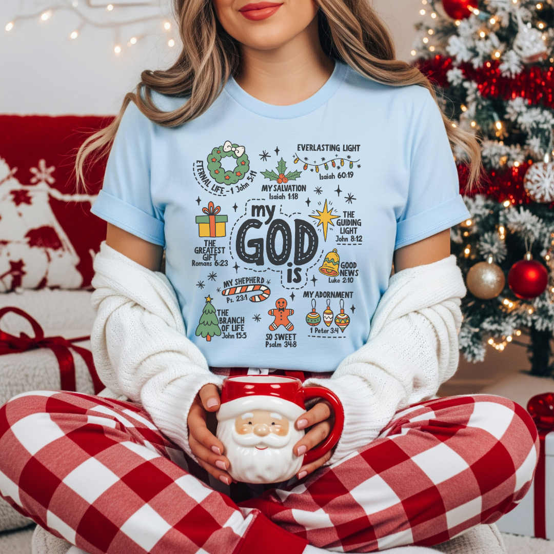 This adorable “My God Is…” Scripture Christmas tee features uplifting Bible verses paired with cute holiday icons. Each phrase highlights a powerful truth about who God is — my Shepherd, my Salvation, my Good News, and more.