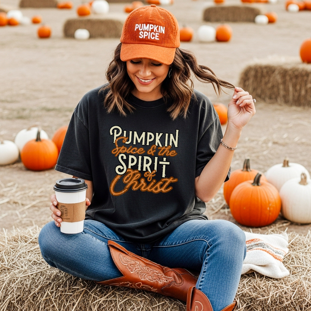 Celebrate your favorite season with a touch of faith in this “Pumpkin Spice & the Spirit of Christ” Christian tee. Designed for girly fashionistas and women of faith, this shirt blends trendy autumn vibes with a bold spiritual message.