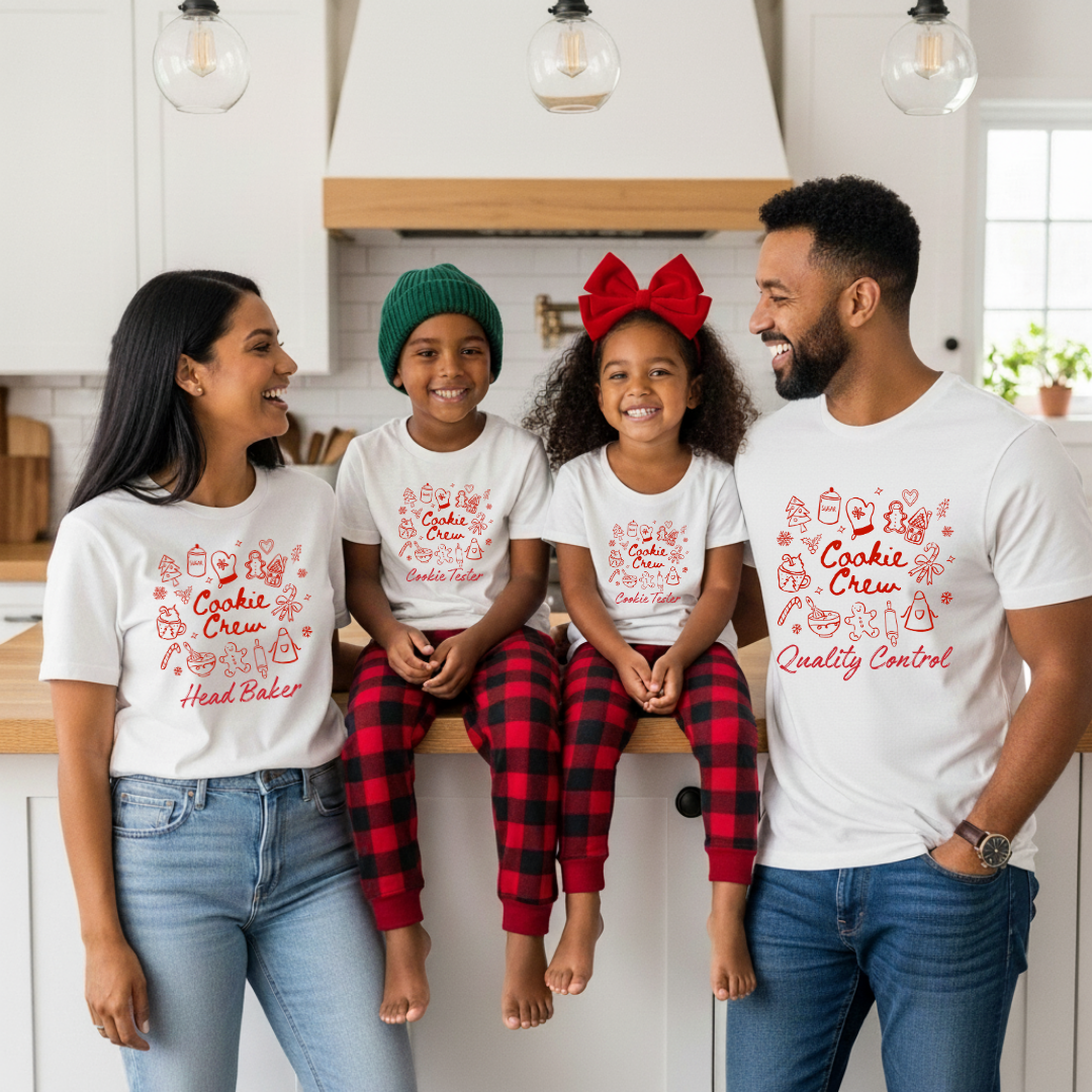 Each shirt features a festive cookie-themed design printed on soft, premium cotton-blend fabric for comfort and style. Whether you’re baking, lounging, or snapping family photos, you’ll look cute and coordinated all season long!