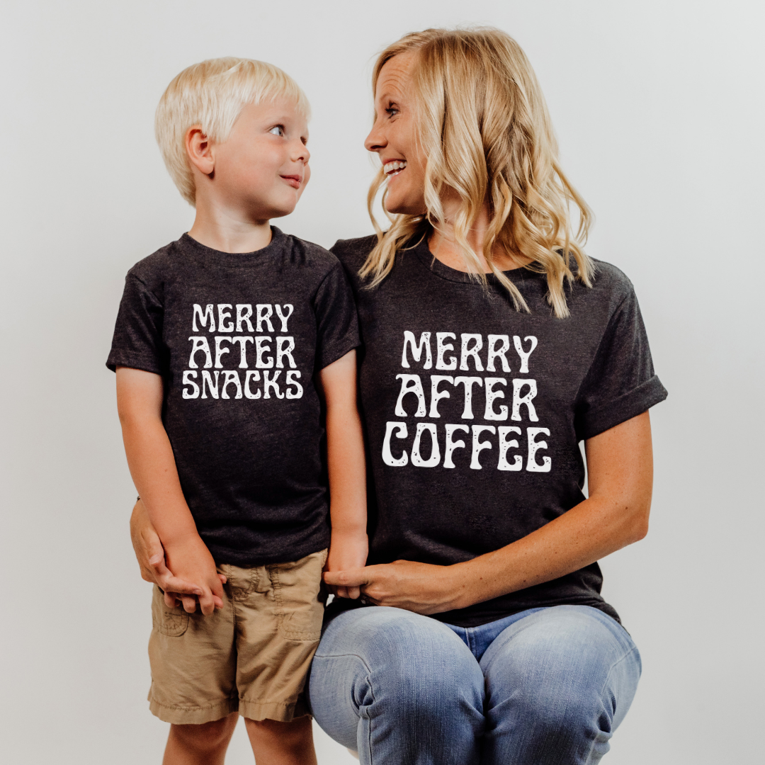 ☕ Funny & Relatable Design: “Merry After Coffee” for mom and “Merry After Snacks” for mini — a perfect pair!