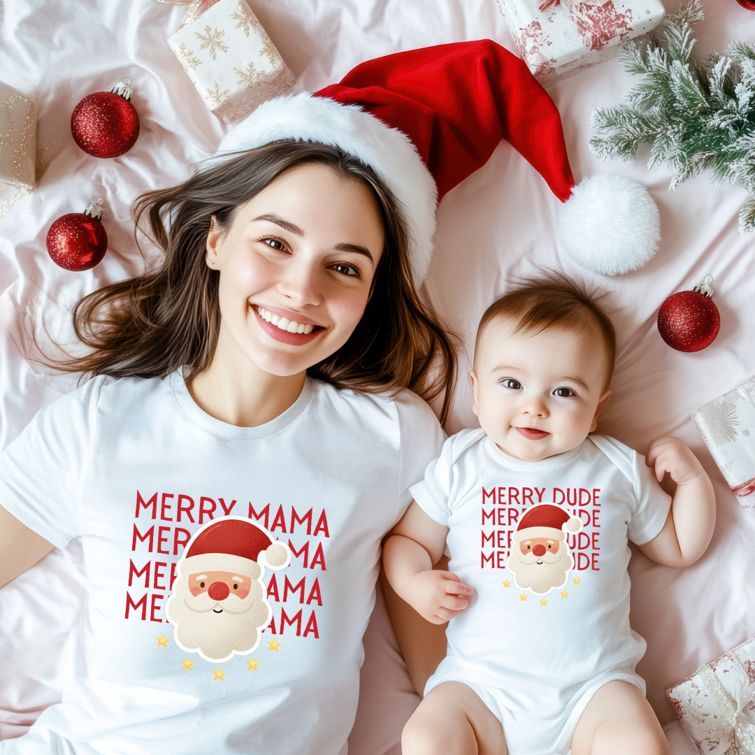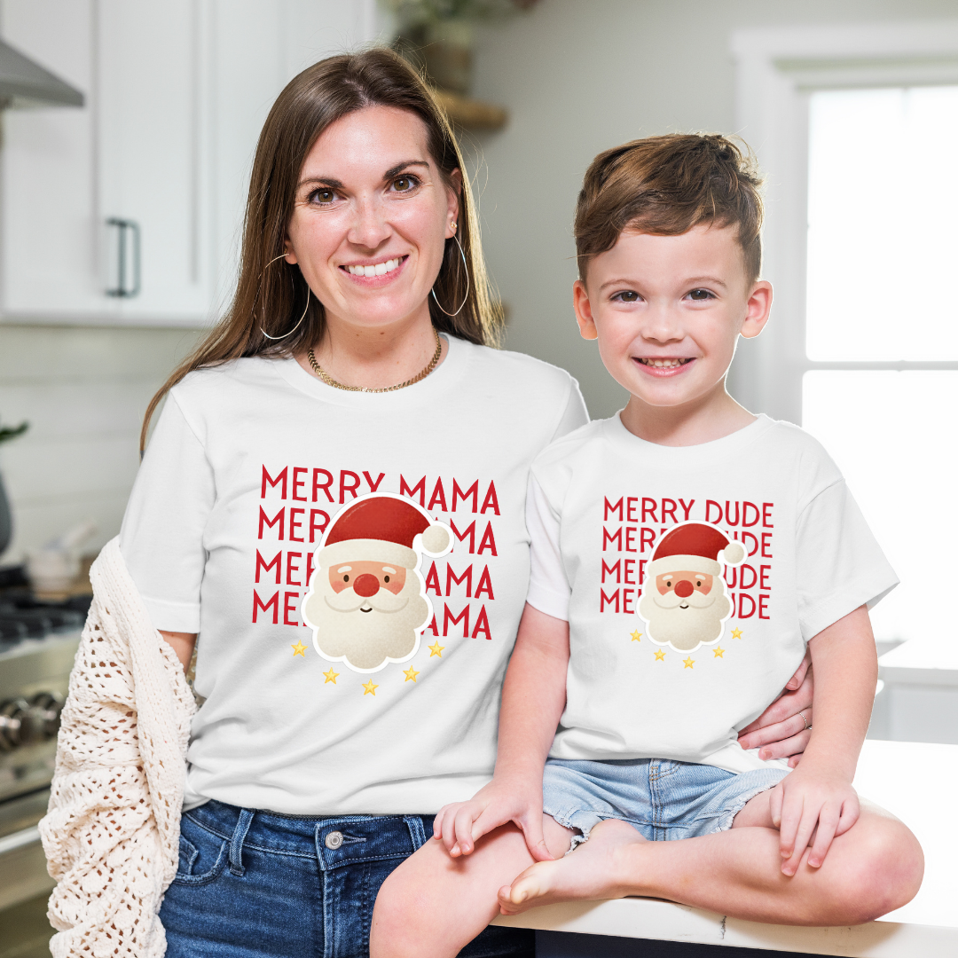Our Merry Mama / Merry Dude Matching Christmas Shirts are the perfect way for moms and sons to share the holiday spirit. Designed with playful Santa-inspired lettering and classic Christmas colors, these shirts make matching fun, festive, and full of love.