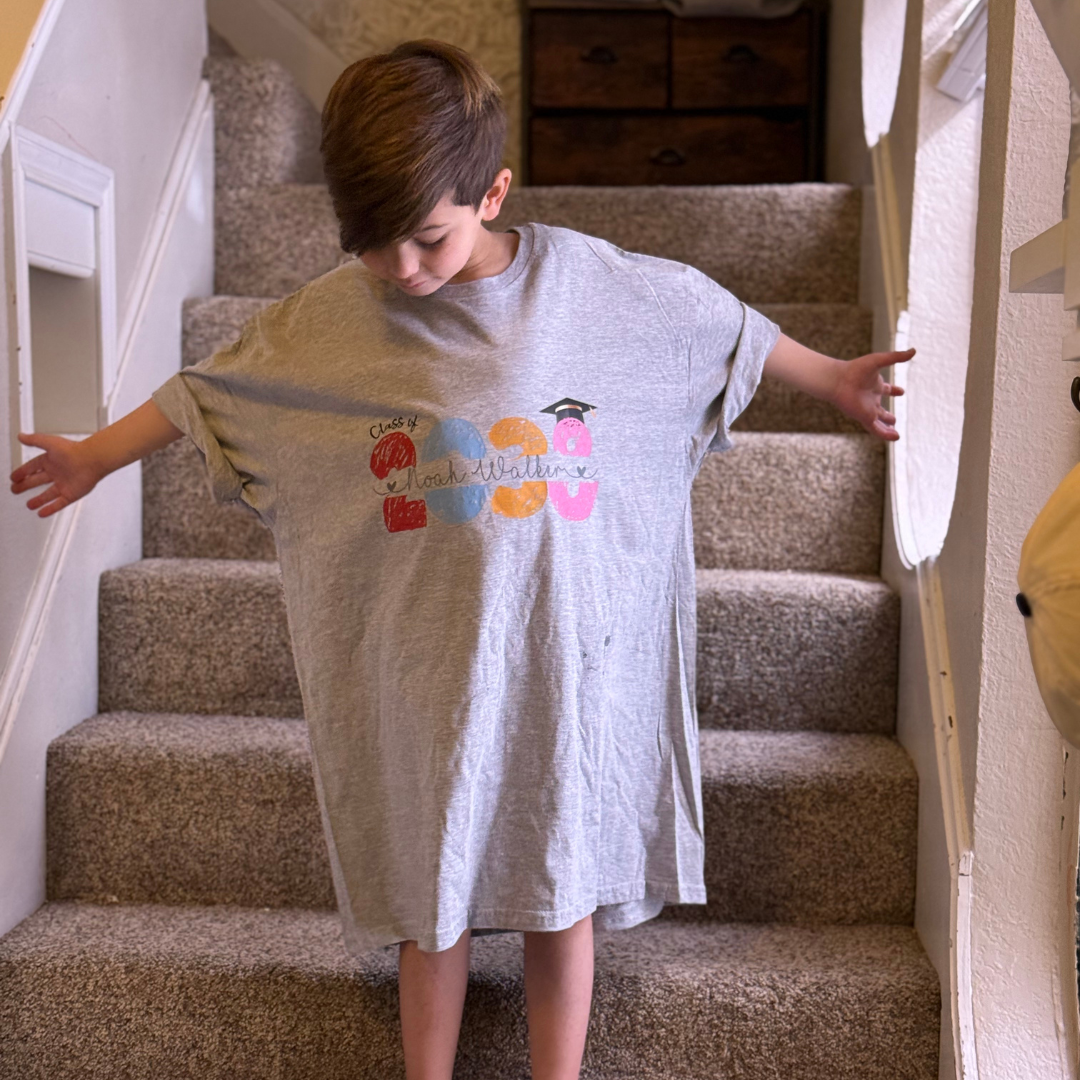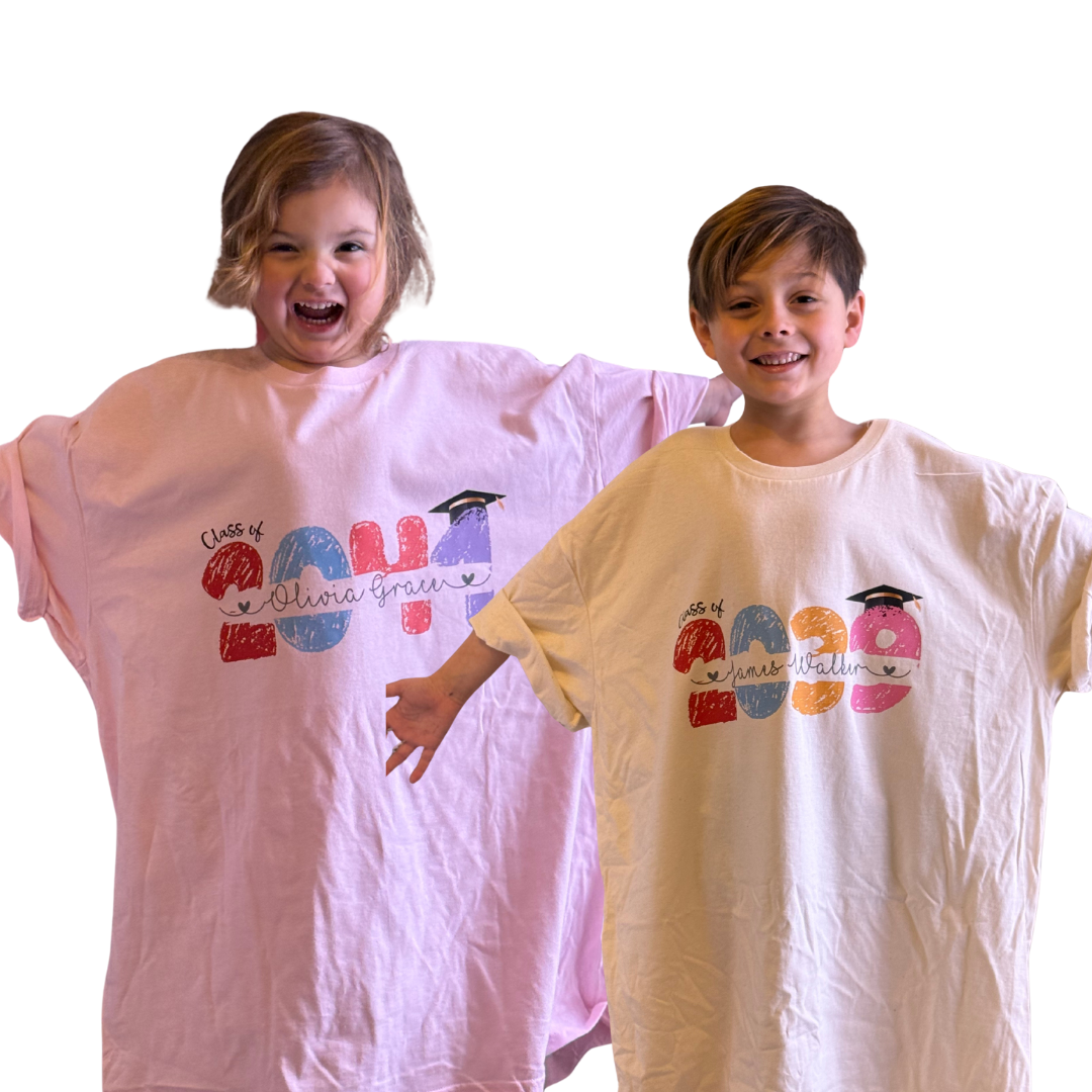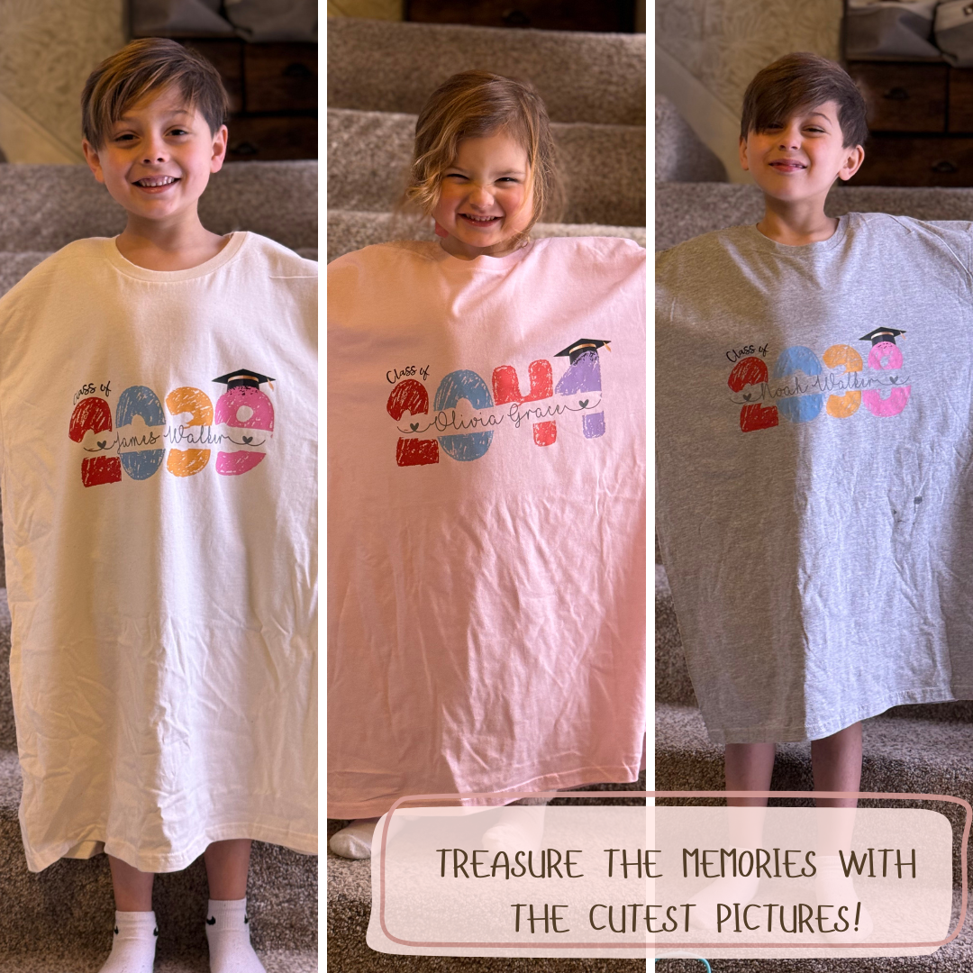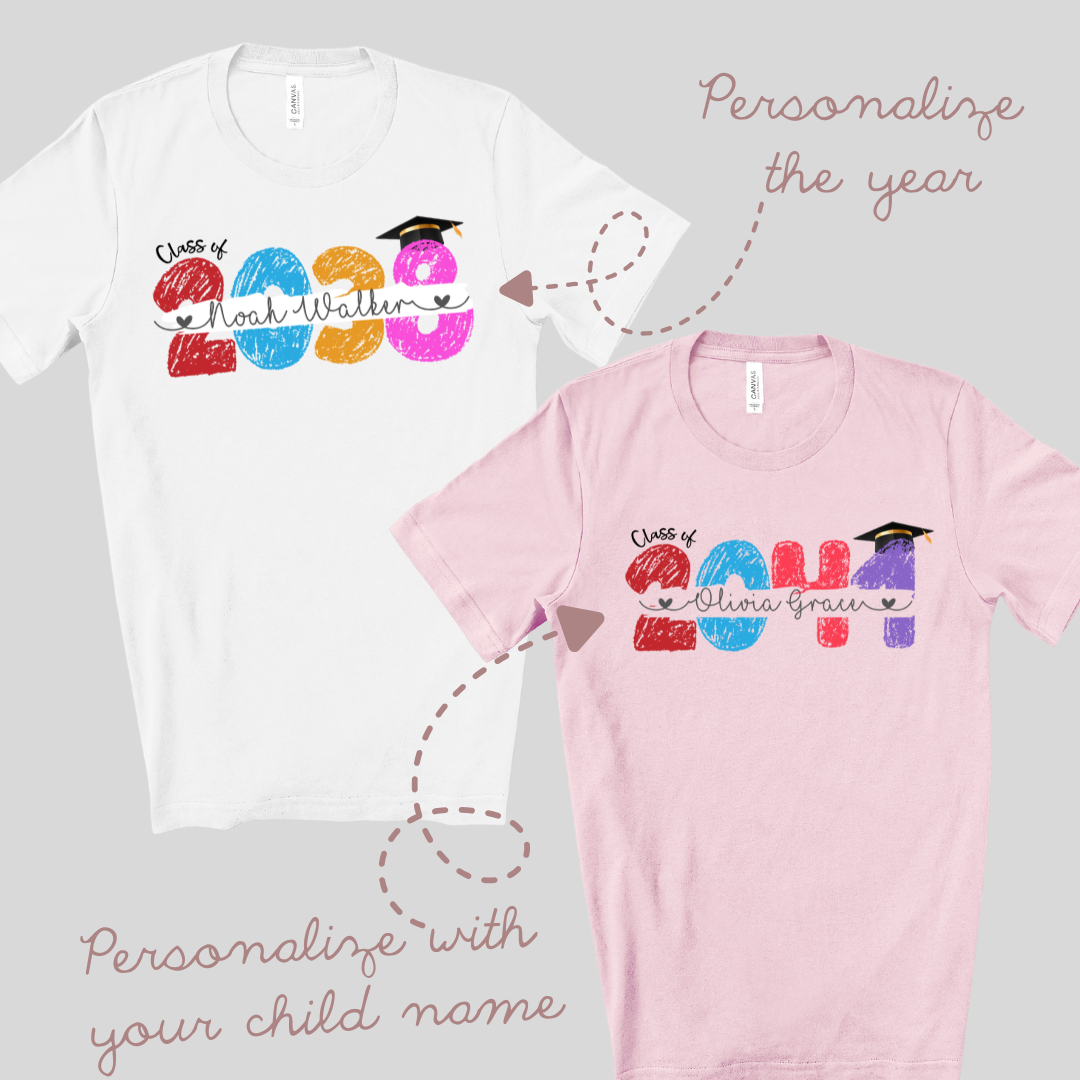 Each shirt features a graduation class year on the front and can be personalized with your child’s name. The back is left blank so your child can add colorful handprints using watercolor or fabric paint as they grow.