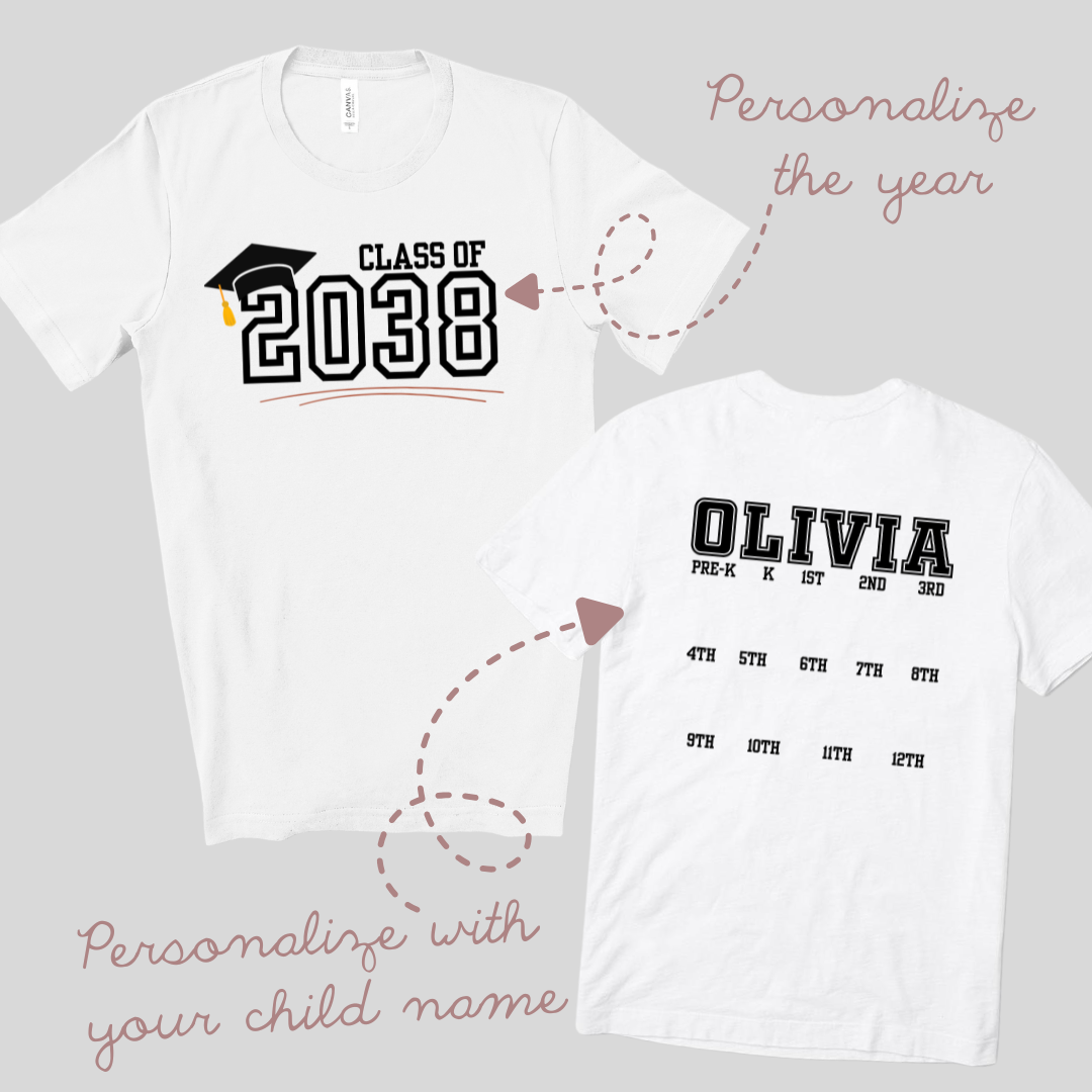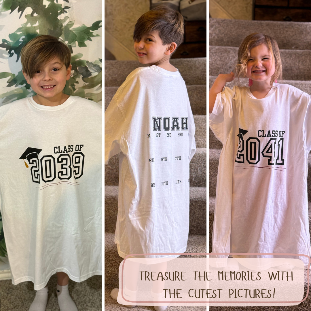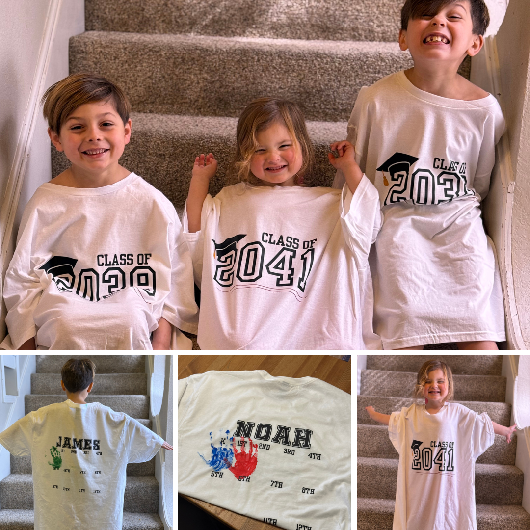 Each shirt features a graduation class year on the front and can be personalized with your child’s name. The back is left blank so your child can add colorful handprints using watercolor or fabric paint as they grow.