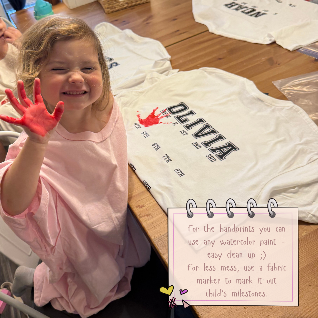 Our Grow With Me Handprint Shirt is designed to capture your child’s growth from year to year by adding a handprint for each school grade. From preschool through elementary and beyond this shirt becomes a meaningful keepsake filled with memories you’ll love looking back on.