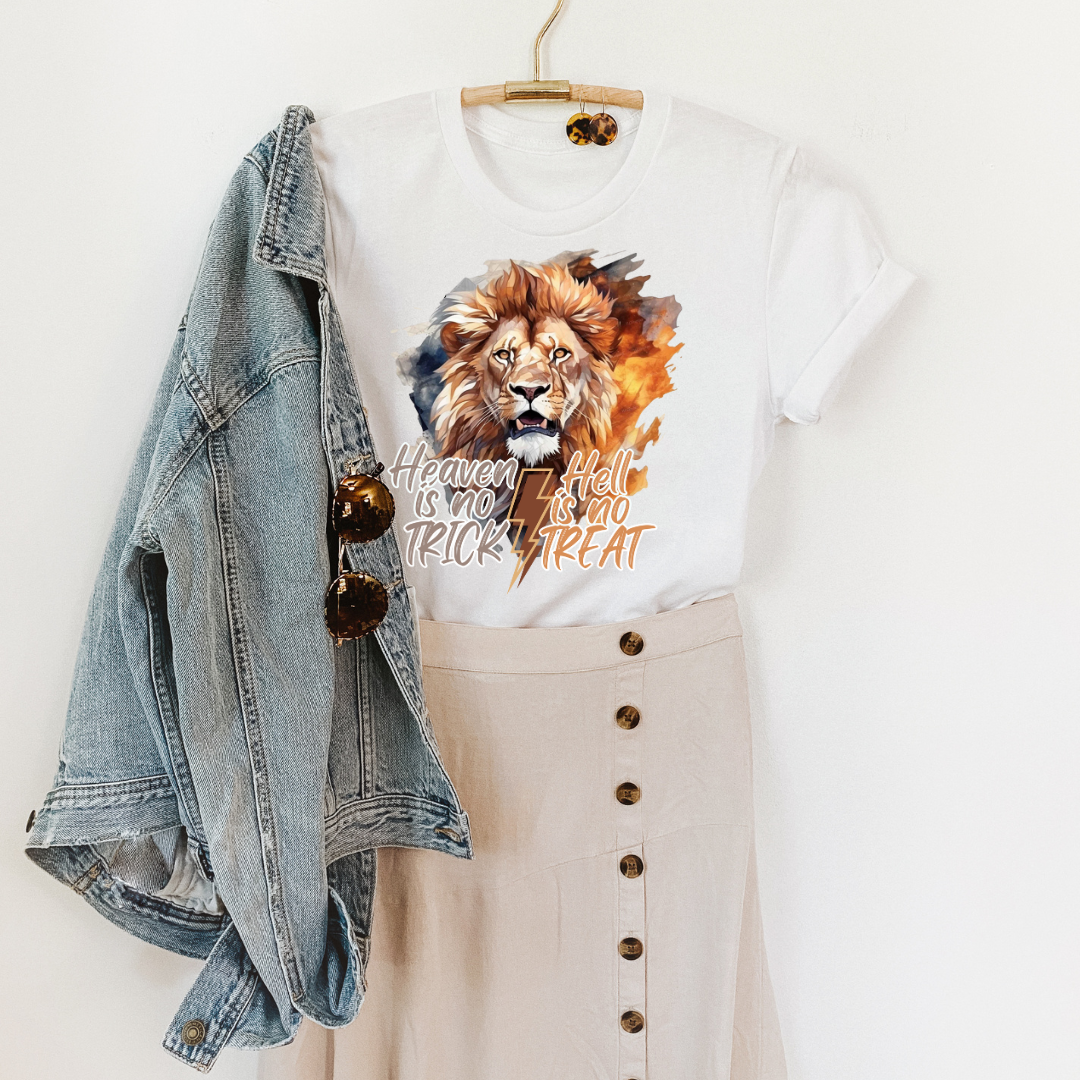 📖 Faith-Inspired Message – “Heaven Is No Trick, Hell Is No Treat” bold Christian design.